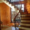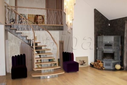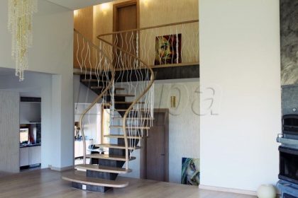 Laiptai iš ąžuolo, tonuoti, su posūkiu. Porankis ovalo formos,