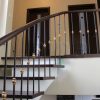 Laiptų pakopos su porankiu pagamintos iš ąžuolo medienos, tonuotos, lakuotos trinčiai atspariu laku.