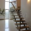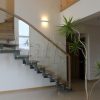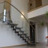 Laiptai ant laiptuotos metalinės konstrukcijos, pagamintos iš stačiakampio formos profilio, su dviem posūkiais. Pakopos ir priešpakopiai skirtingo storio ( 40mm ir 18 mm), pagaminti iš ąžuolo medienos. Kai kuriose pakopose įmontuotas apšvietimas. Porankiai lenkti, stačiakampio formos. Apsauginė tvorelė iš grūdinto stiklo, sumontuoto prie pakopų briaunos, antrame aukšte ant grindų.Visos medinės detalės lakuotos trinčiai atspariu laku.