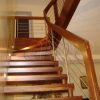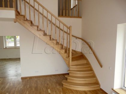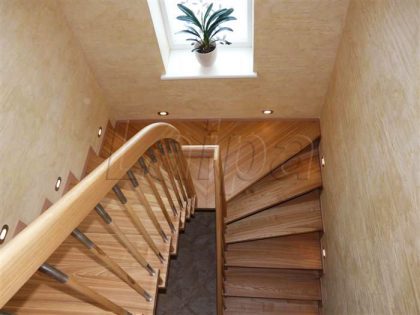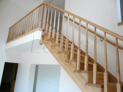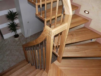 Laiptai is raudonmedžio, su vienu posūkiu. Pakopos 80 mm storio. Porankis –
