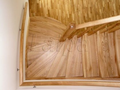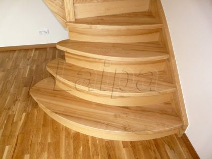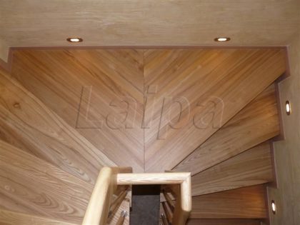 Laiptų pakopos ir porankiai lakuoti trinčiai atspariu laku.