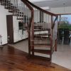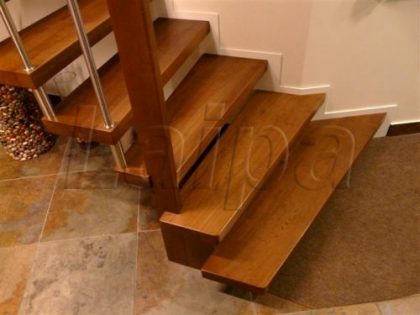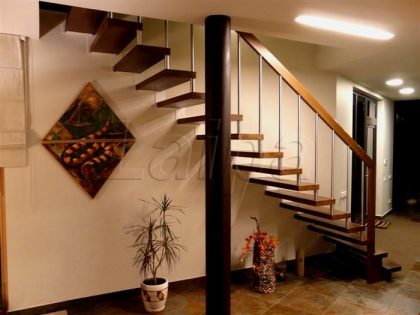 Laiptai iš ąžuolo, tonuoti, su vienu posūkiu. Porankis – stačiakampio formos,