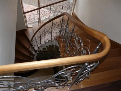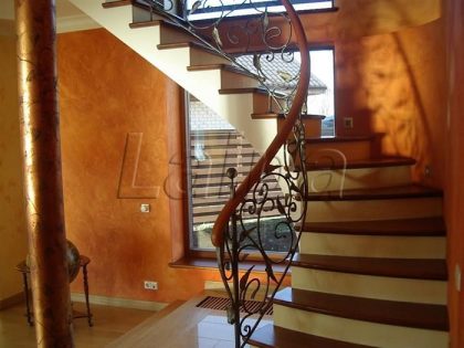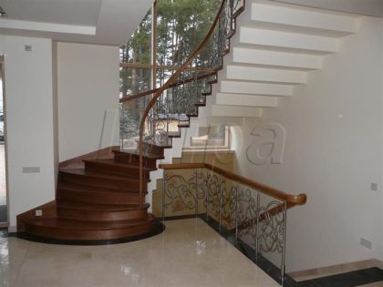 Klasikinio stiliaus laiptai su vienu posūkiu pagaminti iš uosio medienos. Pakopų priekiai palenkti. Statramsčiai tekinti. ,,Grybuko” formos porankiai frezuoti, palenkti. Laiptai lakuoti skaidriu, trinčiai atspariu laku, išsaugant natūralią medienos spalvą.