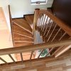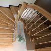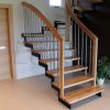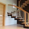 Laiptai sąvaržiniai, su dviem posūkiais. Pakopos ir porankiai iš uosio medienos. Statramsčiai iš apvalių nerūdijančio plieno vamzdelių. Atraminis stulpas, porankiai – stačiakampio formos, viršus apvalintas. Medinės detalės lakuotos trinčiai atspariu laku.