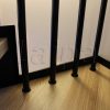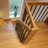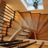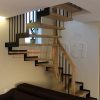 Laiptai ant plonos konstrukcijos prie sienų sąvaržiniai, su dviem posūkiais. 45 mm storio pakopos iš uosio medienos. Atraminiai stulpai stačiakampio formos, apvalinti. Statramsčiai iš plieninių vamzdelių, porankiai stačiakampiai , apvalinti ( R 20 mm). Medinės detalės alyvuotos skaidria alyva. Plieninė konstrukcija su statramsčiais yra dažyti.