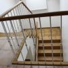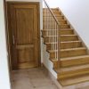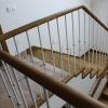 Laiptai su aikštele ir sija prie sienos. Laiptų pakopos, pagamintos iš uosio medienos, su plonais priešpakopiais.