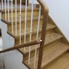 Laiptai su aikštele ir sija prie sienos. Laiptų pakopos, pagamintos iš uosio medienos, su plonais priešpakopiais. Porankiai apvalios formos. Medinės detalės tonuotos ir lakuotos trinčiai atspariu laku. Statramsčiai pagaminti iš dažyto plieninio strypo su išskirtine chromuota detale