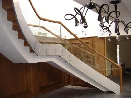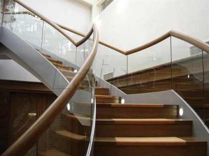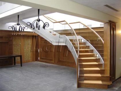 Laiptų pakopos ir porankiai lakuoti trinčiai atspariu laku.