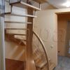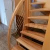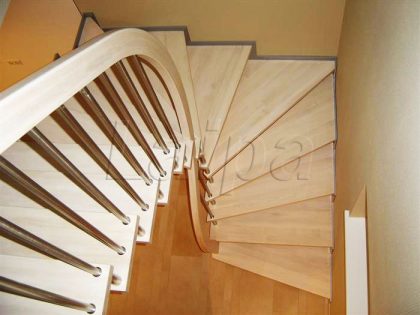 Laiptai iš uosio, su dviem posūkiais ir išplatintu atraminiu stulpu.