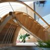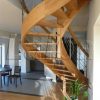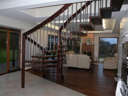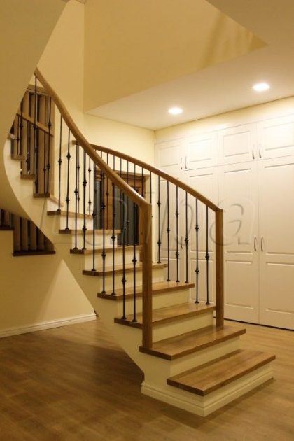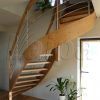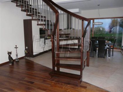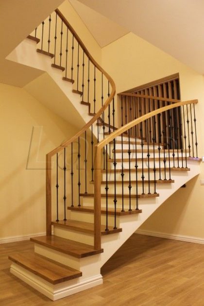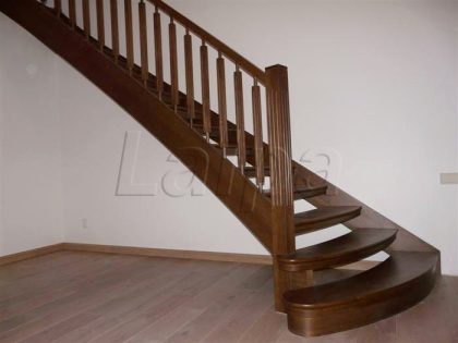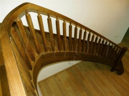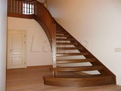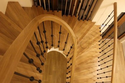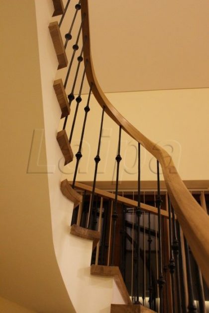 Laiptai iš ąžuolo su sukta medine sija. Porankiai – stačiakampio formos,