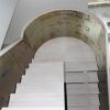 Laiptai iš ąžuolo, tonuoti, su lenkta aikštele. Porankis kvadrato formos.