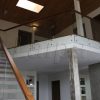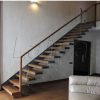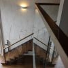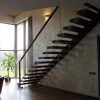 Laiptai su plačia plienine sija prie sienos. Pakopos pagamintos iš ąžuolo medienos, kurių storis 80mm. Apsauginė tvorelė ant laiptų ir antrame aukšte iš 10 mm skaidraus grūdinto stiklo. Porankis kvadrato formos, apvalintas mažu spinduliu ( R-2mm). Pakopos ir porankiai tonuoti spiritiniu beicu ir lakuoti trinčiai atspariu laku.