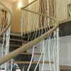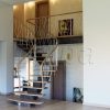 Laiptai ant siauros, platėjančios betoninės konstrukcijos. Laiptų pakopos standartinio storio, pagamintos iš ąžuolo medieno. Porankis apvalios formos ( d-40mm), suktas. Apsauginės tvorelės statramsčiai pagaminti iš skirtingo storio plieninių, lankstytų strypelių, naudojant kalvišką techniką. Atraminiai statramsčiai – mūsų įmonės meistro autorinis darbas. Plieninės detalės dažytos metalui skirtais dažais. Medinės detalės tonuotos ir alyvuotos ( alyva, skirta pakopom, atspari trinčiai).