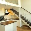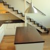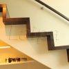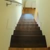 Laiptai ant paslėptos plieninės konstrukcijos su gipso pl. apdaila. Pakopos su priešpakopiais vienodo storio , pagamintos iš uosio medienos. Porankis, pritvirtintas prie sienos, kvadrato formos. Apsauginė tvorelė antrame aukšte iš grūdinto 10mm stiklo, sumontuoto prie perdangos šono. Medinės detalės tonuotos , lakuotos skaidriu, trinčiai atspariu laku.